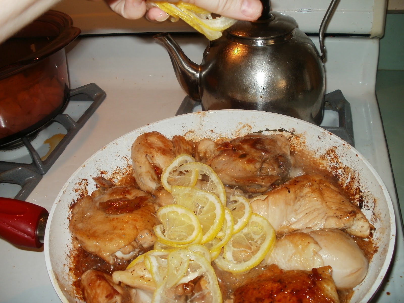 Add the slices of lemon and let simmer until the chicken is thoroughly cooked.